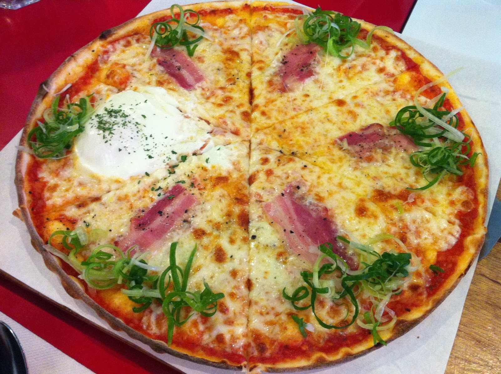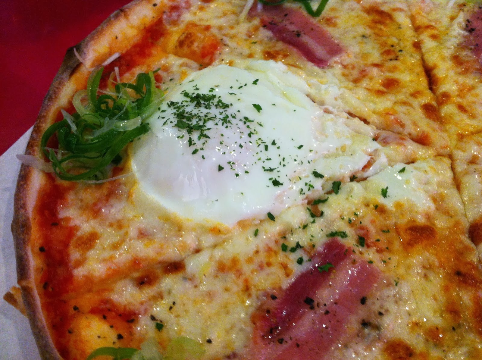整個雞蛋在比薩上面,吃法是把蛋弄爛,然後用湯匙把蛋黃汁平均掃在比薩上面。