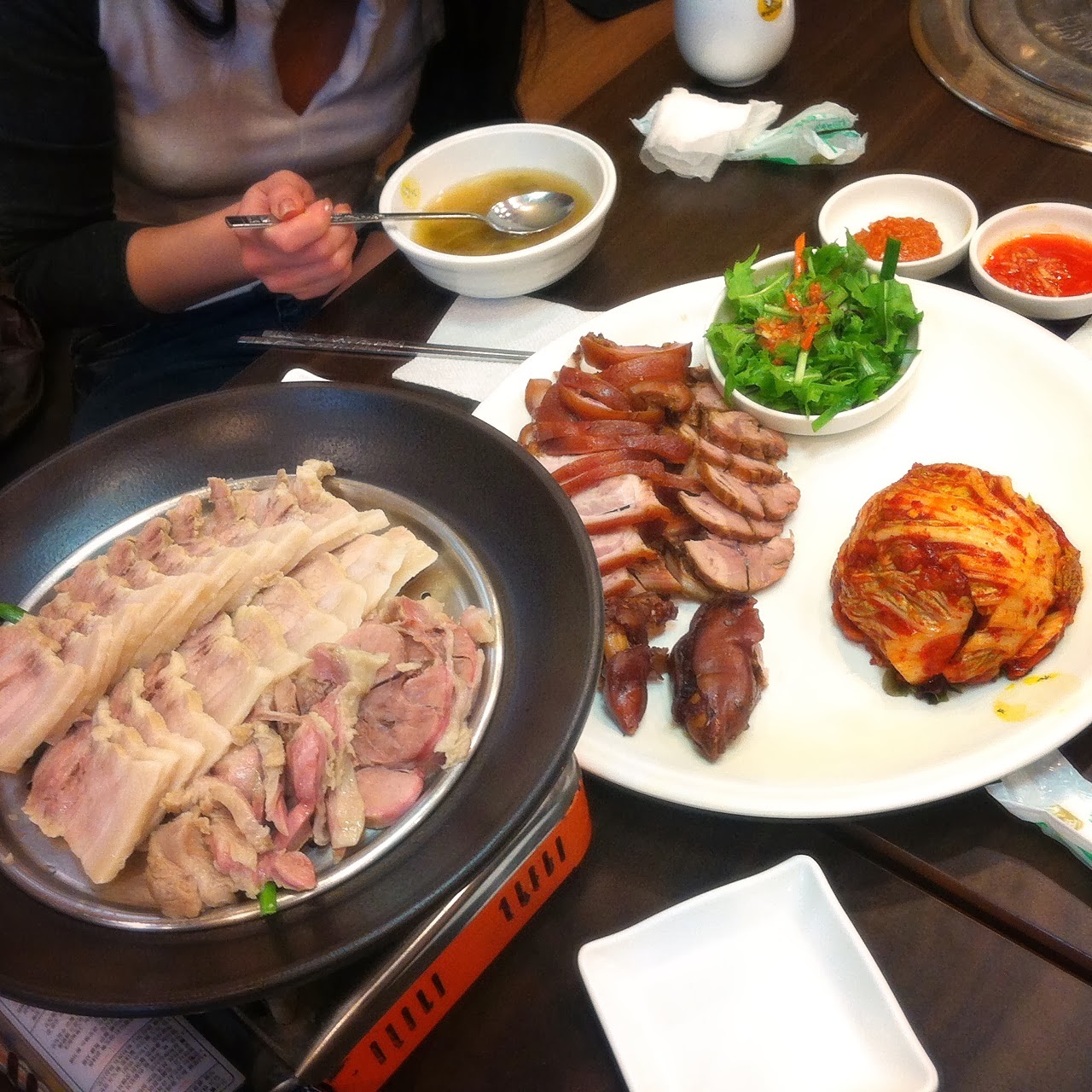 帶甜辣的泡菜把五花肉的油膩抵消,只剩下肉的柔軟口感。美味。