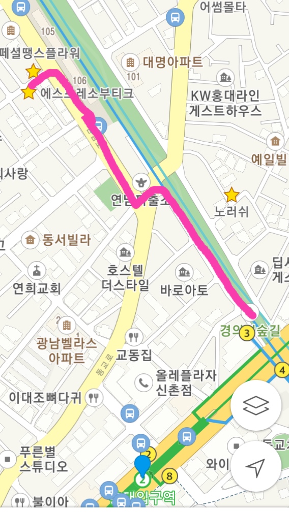 從弘大入口站3號出口出來直走,跟著粉紅路線走,看到灰色3層高的住宅,2樓便是弘大延南洞Espresso Boutique。