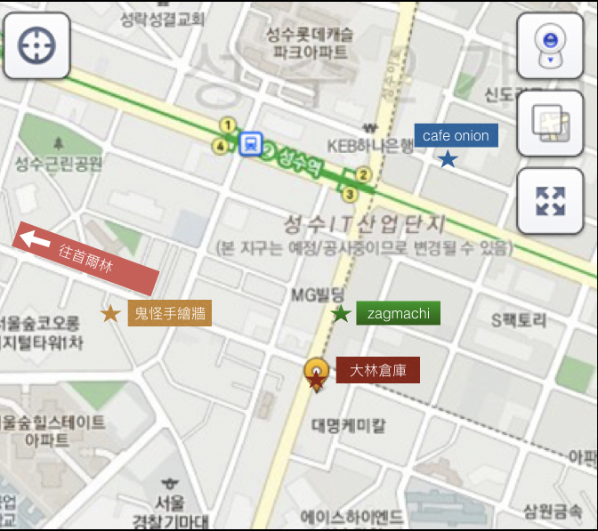 因為我是先到cafe onion(2號出口)再往大林倉庫,然後再到手繪牆 (4號出口)- 首爾林,