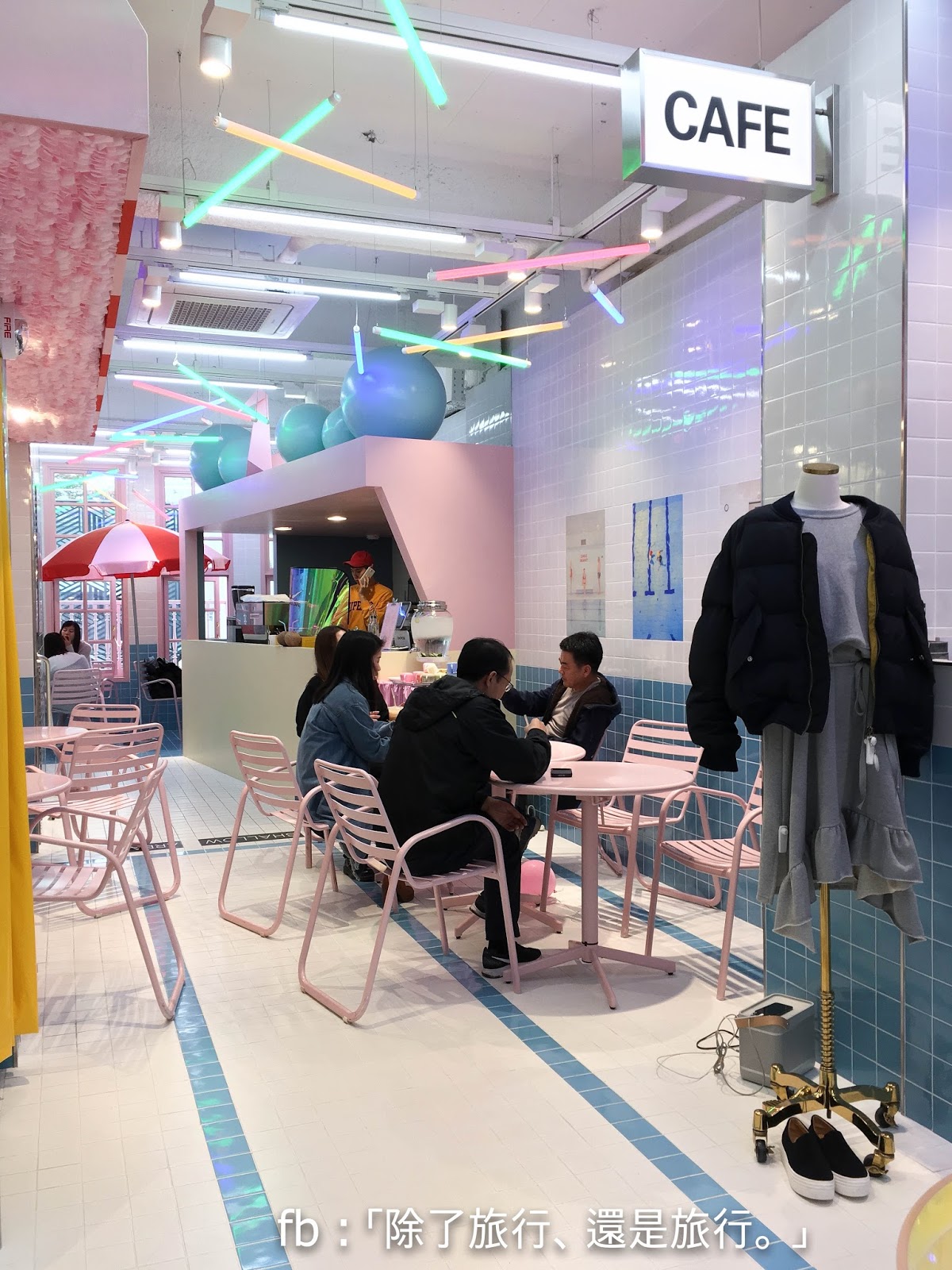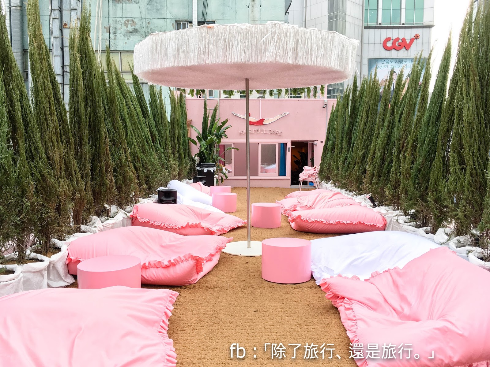 走過種了綠色盆裁的樓梯,來到粉紅色海的 rooftop cafe!