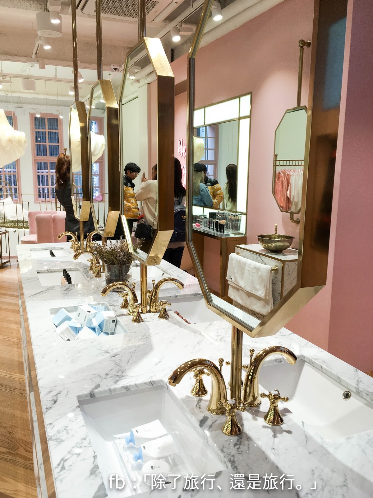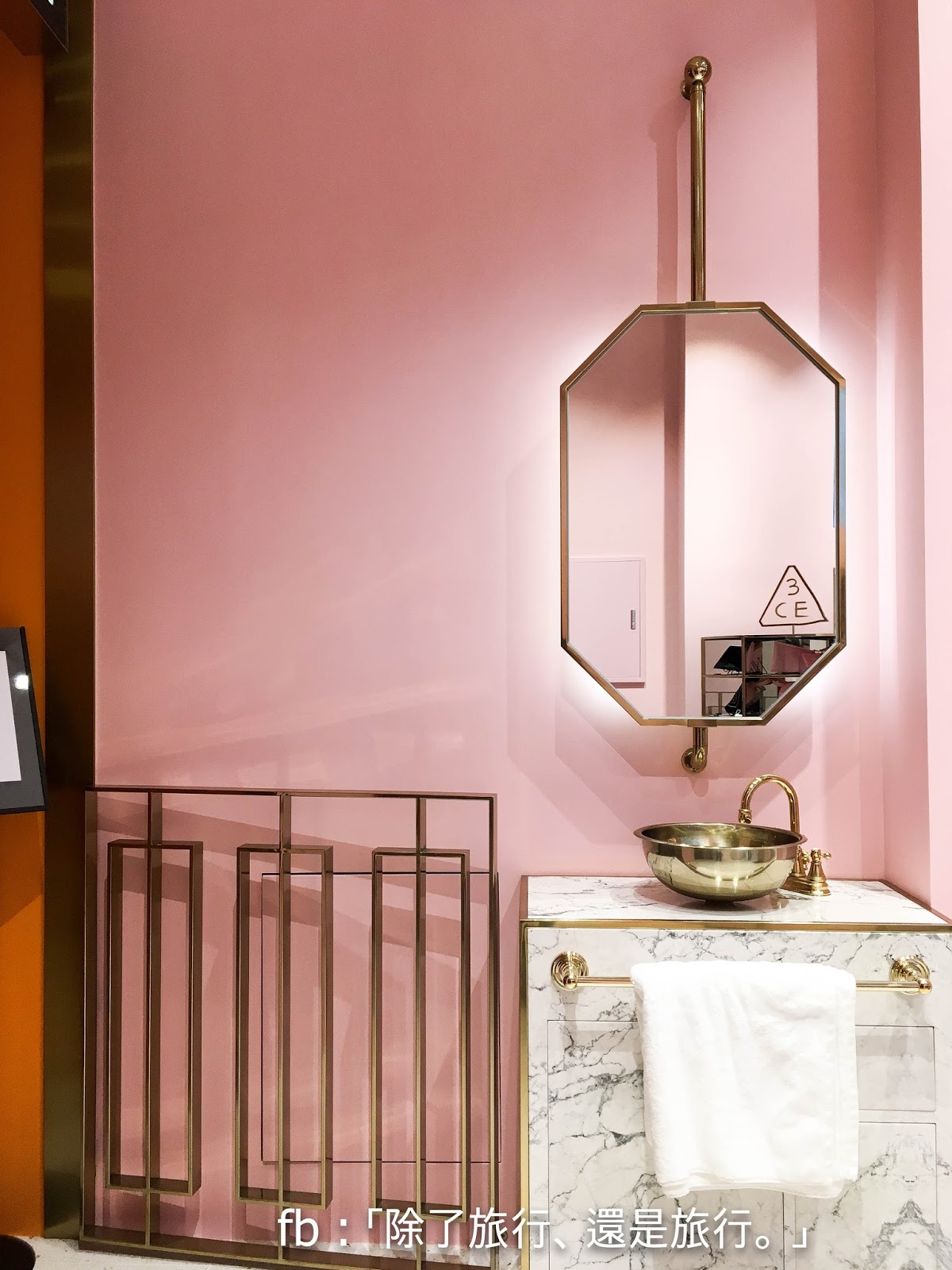 歐式大宅洗手盤裡的是3CE的洗面用品,也太可愛了!