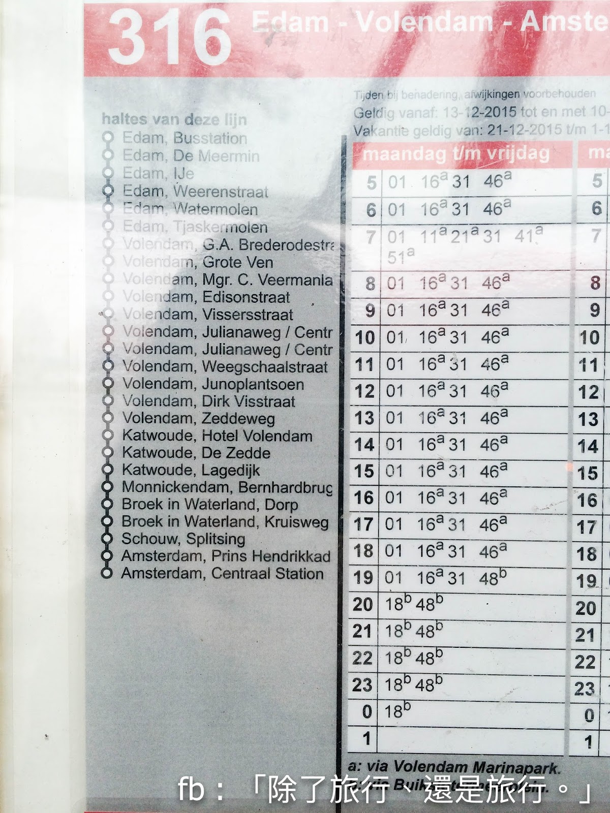 在阿姆斯特丹中央巴士站(跟指示牌就找得到),搭乘316 號巴士,可以在艾登(15分鐘)下車,或直接到福倫丹(30分鐘)。