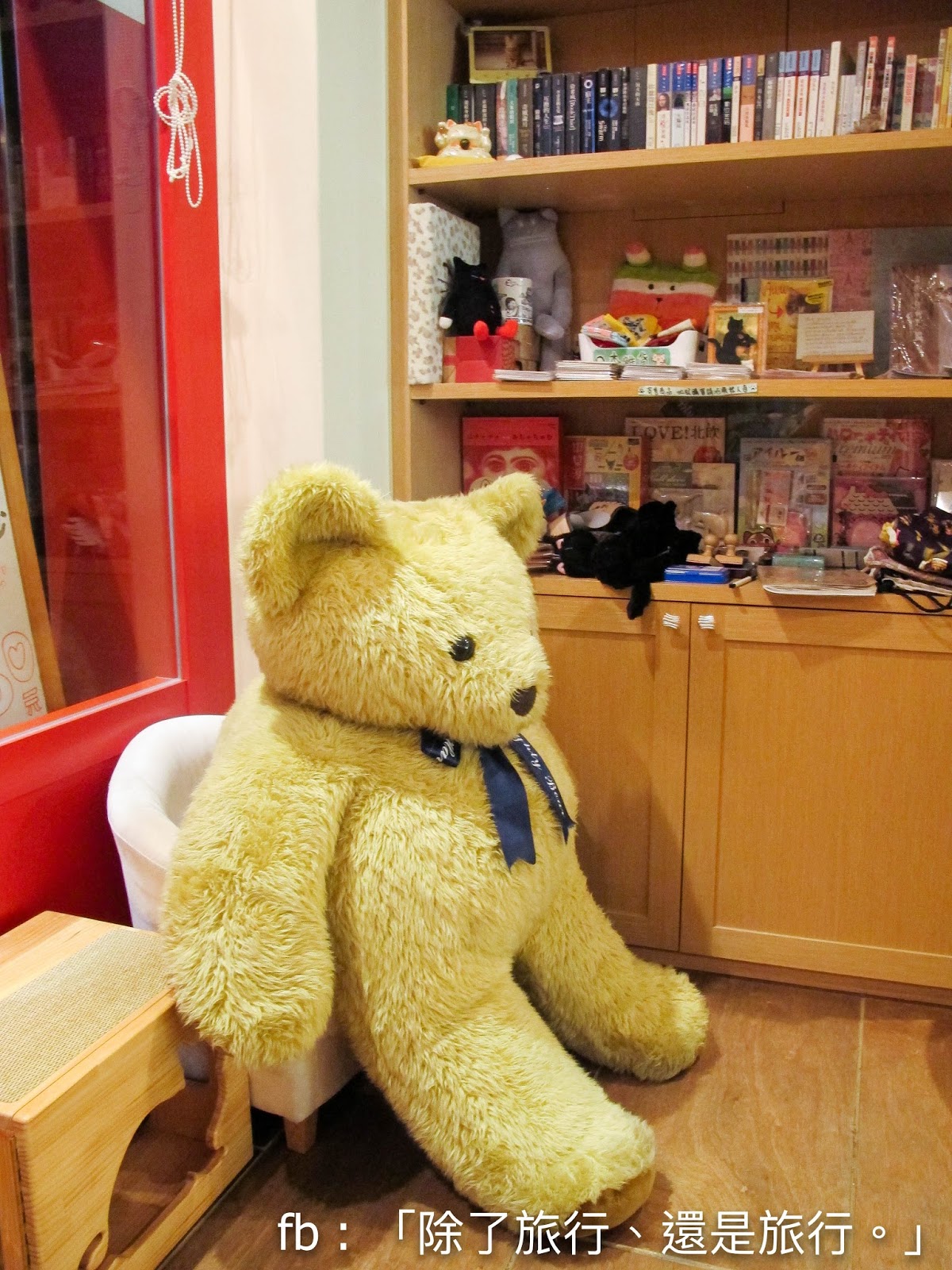 門口旁邊的櫃子也放滿了貓貓精品文具,還有大熊布偶來迎客。