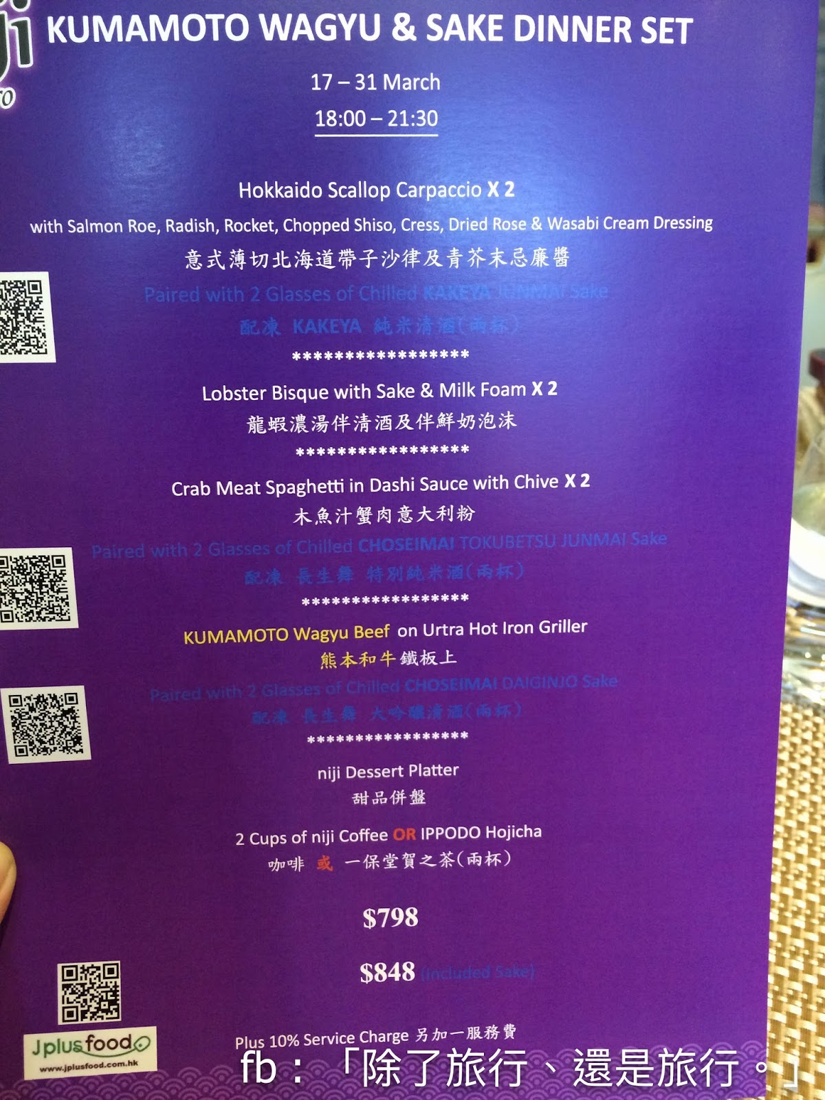 其中一家就是我這次試到的niji bistro & Noritake,5道菜的2人套餐(包括清酒)$848 。