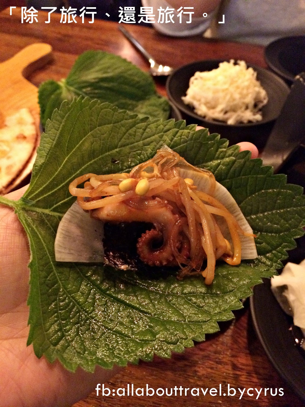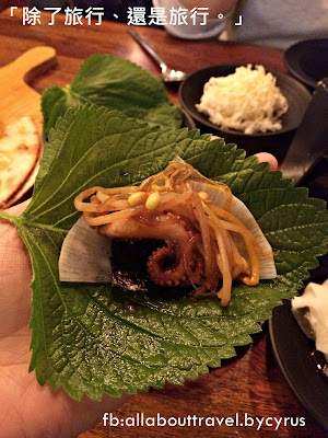 最標準的吃法,就是把所有伴菜跟辣炒小章魚一起包來吃。