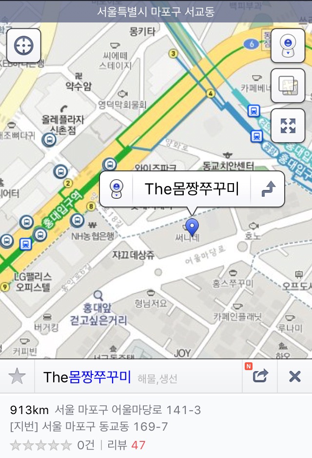 弘大號出口出來後轉右,到大迴旋處後轉左直走,便會看到弘大「몸짱」辣炒小章魚的店面。
