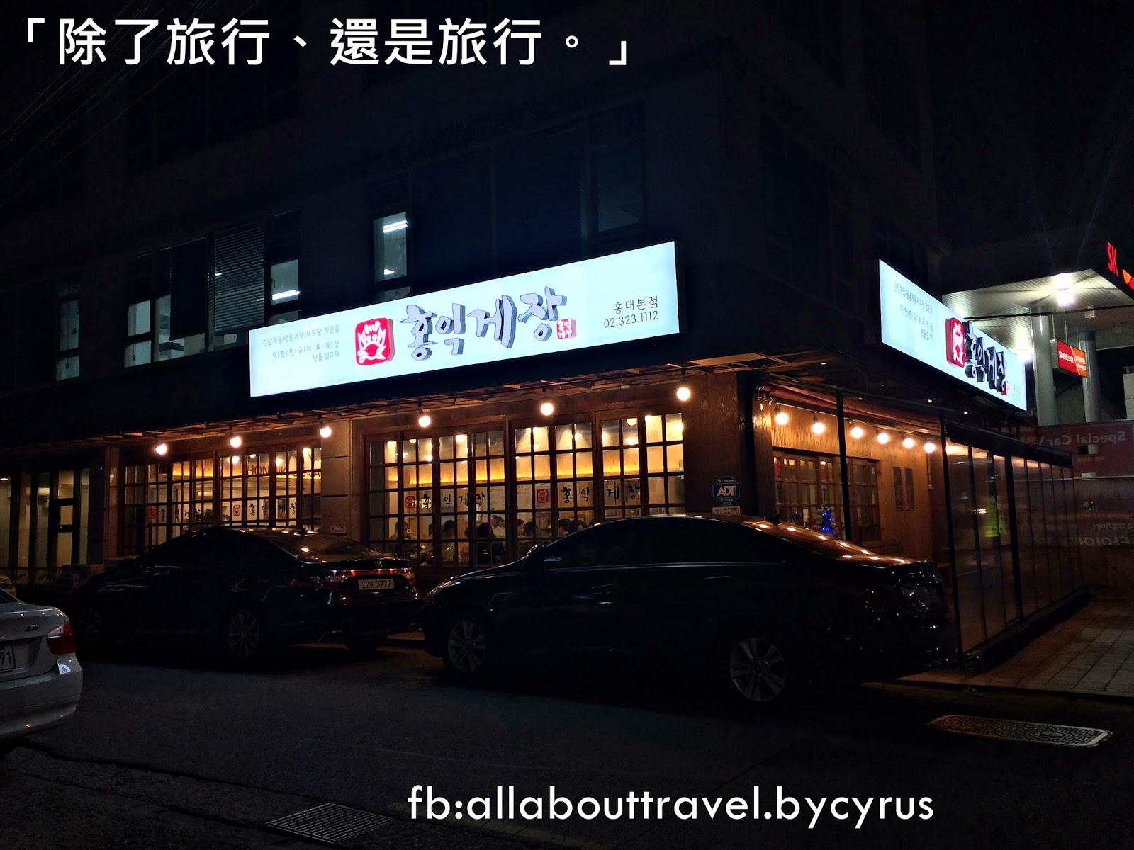 弘大地鐵站1號出口直走,轉右直走過馬路(4-5),再直走大概8分鐘便會看到弘大弘益醬蟹(홍익게장)的店面。