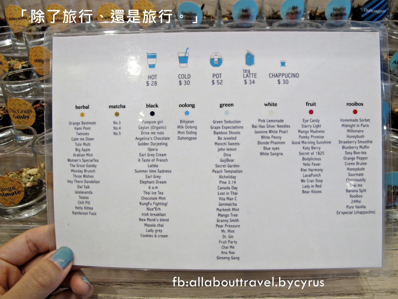 除了chappucino,其他的茶葉都可以沖泡成其餘4種: hot / cold / pot 和 tea latte。