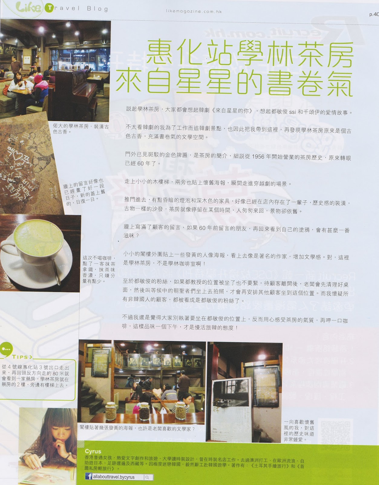 <div class="separator" style="clear: both;">今期的旅遊專欄,帶大家到惠化站學林茶房,感受懷舊書卷氣!</div><div class="separator" style="clear: both;"><br /></div><div class="separator" style="clear: both;">網址:<a href="http://www.likemagazine.com.hk/" target="_blank">Like Magazine</a></div><div class="separator" style="clear: both;"><br /></div><div class="separator" style="clear: both;">我的臉書專頁:<a href="https://www.facebook.com/allabouttravel.bycyrus">「除了旅行、還是旅行。」</a></div><div class="separator" style="clear: both;">instagram: dreamercyrus</div><div class="separator" style="clear: both;"><br /></div><div class="separator" style="clear: both;">原文網址:<a href="http://nekoxcyrus.blogspot.hk/2015/03/blog-post_4.html" target="_blank">『韓國。景點』不為星星,來茶房感受懷舊書卷氣:惠化站學林茶房학림다방</a></div><div class="separator" style="clear: both;"><br /></div><div class="separator" style="clear: both;">延伸閱讀:</div> <a href="http://nekoxcyrus.blogspot.hk/2015/03/blog-post_7.html" target="_blank">『韓國。景點』在充滿藝術粒子的巷弄散步:弘大「沒關係是愛情」拍攝景點</a><br /><a href="http://nekoxcyrus.blogspot.hk/2015/03/blog-post_24.html" target="_blank">「韓國。景點」追尋韓劇鏡頭下,首爾絢麗的夜:鷹峰山夜景之美</a><br /><div class="separator" style="clear: both;"><br /></div> <a href="http://nekoxcyrus.blogspot.hk/2015/02/blog-post_9.html" target="_blank">美食文章大整理!一個人的韓食餐桌/與朋友分享的韓食美味大堆頭/韓國咖啡狂熱篇</a><br /><a href="http://nekoxcyrus.blogspot.hk/2015/02/cyrus.html" target="_blank">韓國景點。住宿。生活。文章大整理!特色住宿/文青散策/傳統市場/Cyrus 旅韓生活篇</a><br /><br /><br /><div class="separator" style="clear: both; text-align: center;"><a href="http://1.bp.blogspot.com/-zuMYfwn-nQk/VaCUEukU70I/AAAAAAAAOSs/eCBjfYgBXpU/s1600/like_logo-06.png" imageanchor="1" style="clear: right; float: right; margin-bottom: 1em; margin-left: 1em;"><br /></a></div><div style="margin-left: 1em; margin-right: 1em; text-align: left;"><a href="http://4.bp.blogspot.com/-xVTaYZIdnhQ/VaCUF5K1d4I/AAAAAAAAOS0/eGXcfV-TPsc/s1600/SCN_0025.jpg" imageanchor="1" style="clear: left; float: left; margin-bottom: 1em; margin-right: 1em;"><img border="0" height="640" src="http://4.bp.blogspot.com/-xVTaYZIdnhQ/VaCUF5K1d4I/AAAAAAAAOS0/eGXcfV-TPsc/s640/SCN_0025.jpg" width="500" /></a></div><br /><div class="separator" style="clear: both; text-align: center;"><br /></div><div class="separator" style="clear: both; text-align: center;"><a href="http://1.bp.blogspot.com/-zuMYfwn-nQk/VaCUEukU70I/AAAAAAAAOSs/eCBjfYgBXpU/s1600/like_logo-06.png" imageanchor="1" style="clear: left; float: left; margin-bottom: 1em; margin-right: 1em;"><img border="0" height="103" src="http://1.bp.blogspot.com/-zuMYfwn-nQk/VaCUEukU70I/AAAAAAAAOSs/eCBjfYgBXpU/s200/like_logo-06.png" width="200" /></a></div><br />