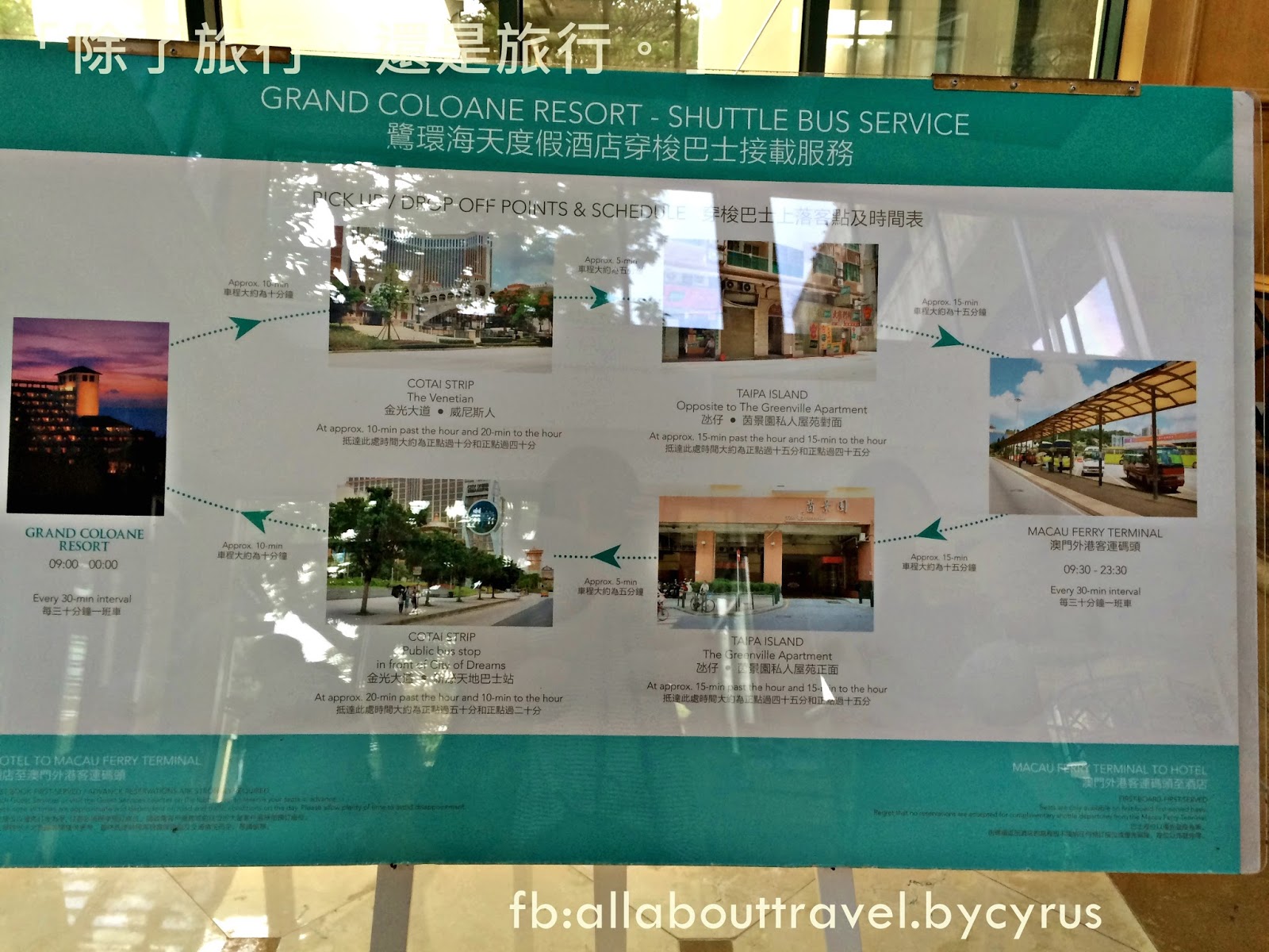 而從碼頭回酒店的車則由9:30 開始,中途經City of Dreams,每半小時一班。