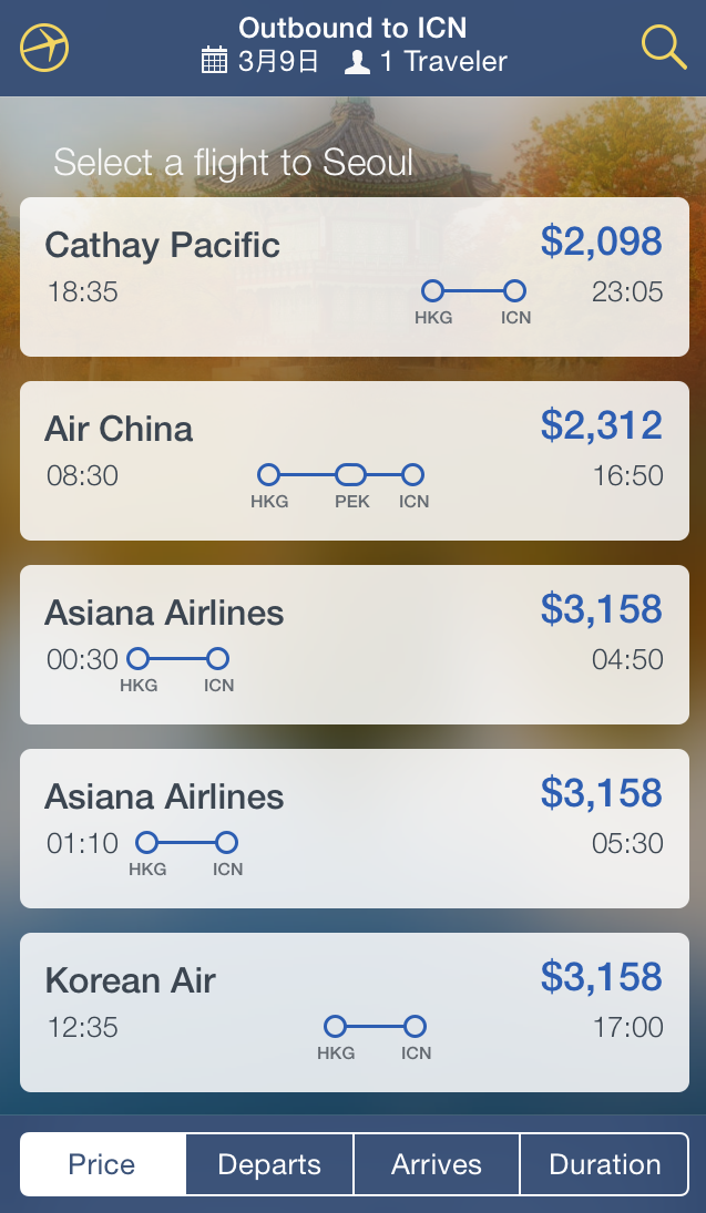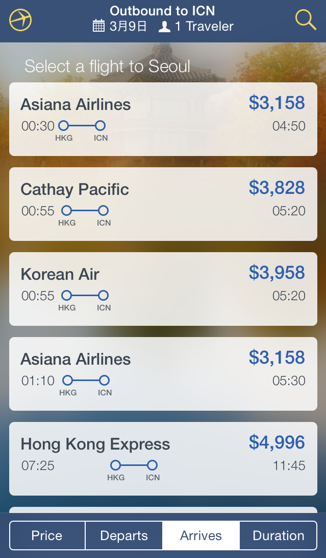 然後所有航班、時間、接駁點和價錢都清楚列明,而且優惠航班也有列出來,好像之前Cathay Pacific的 fanfare 也可以買得到!