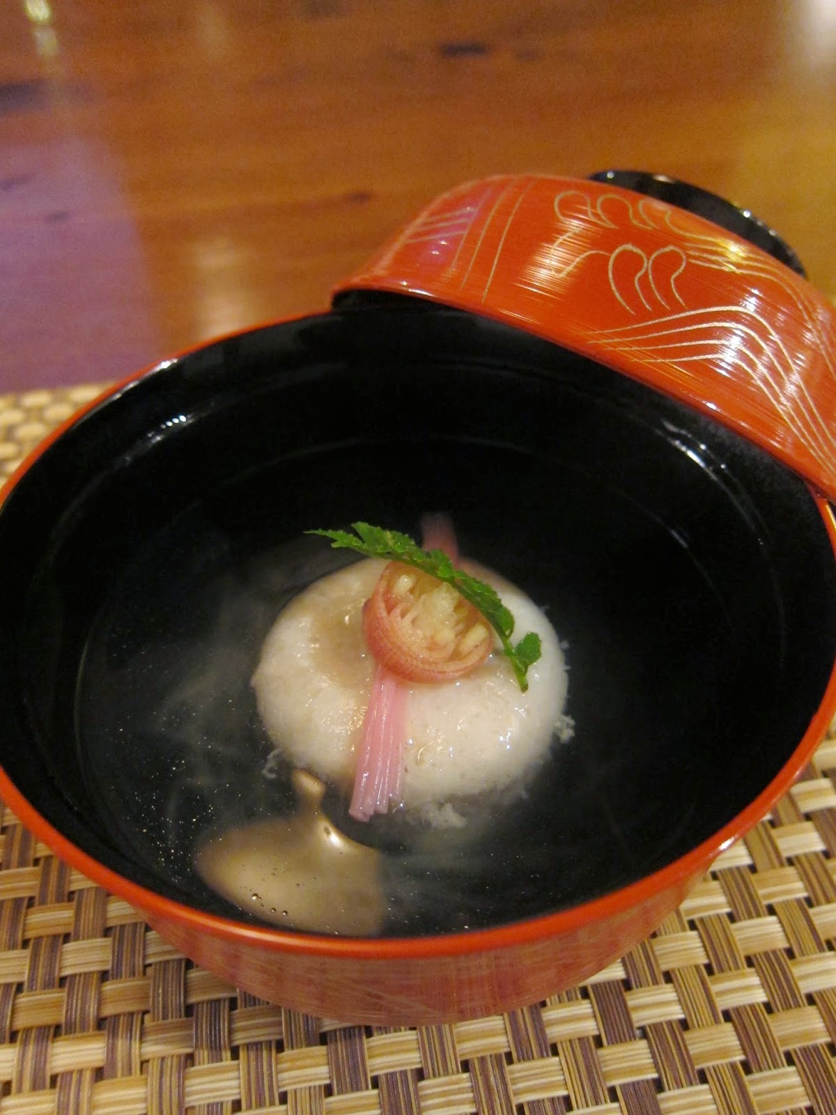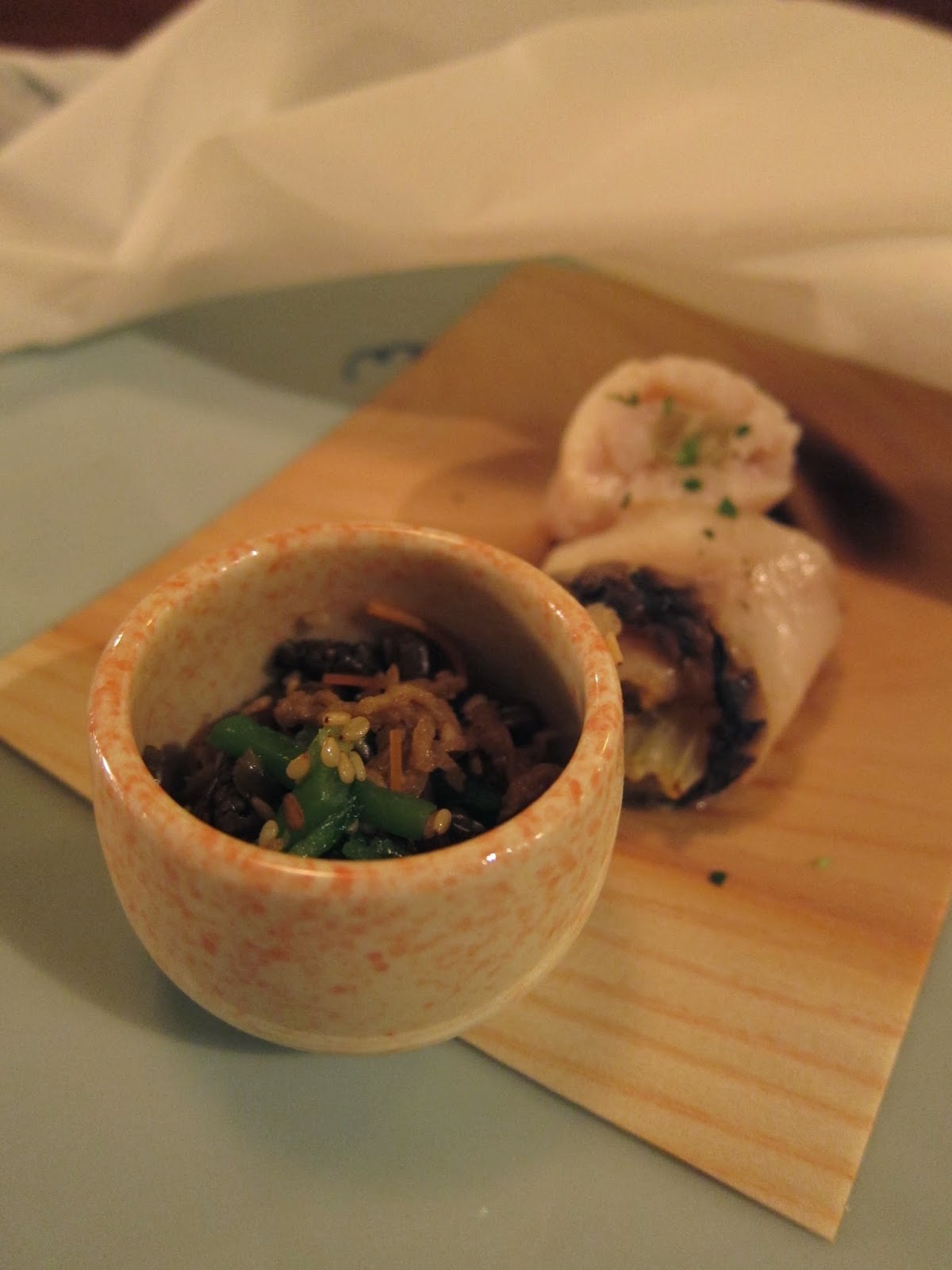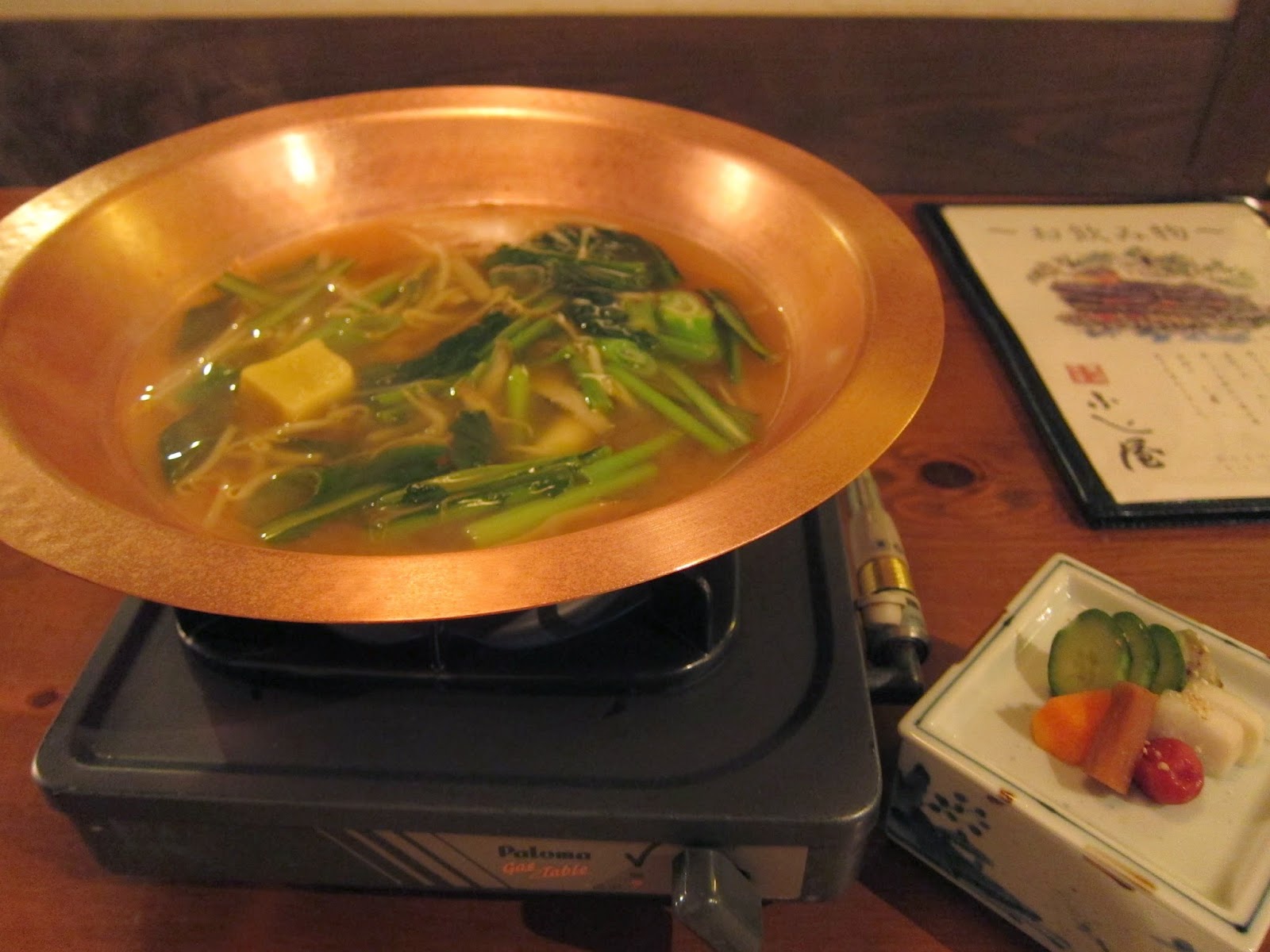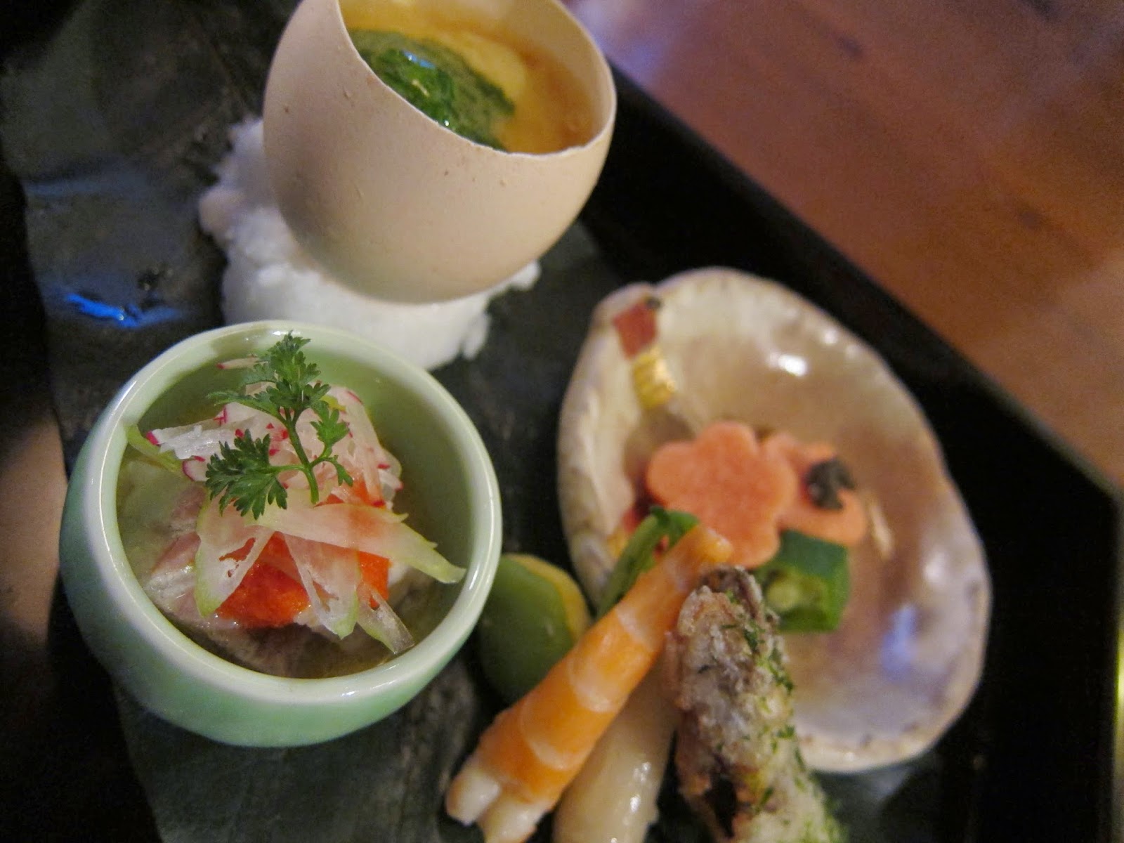 食事時間。這是我在後來才發現的,為什麼我會感覺那麼侷促。不是因為我只有一個人的原因(或許有一點點吧),但日本客人和侍者營造的那種「輕輕的盡量不要發出聲音」的氣氛,使我這個一向神經大條的人變得壓力很大。恐怕放下湯匙的那一點聲音就失禮了。