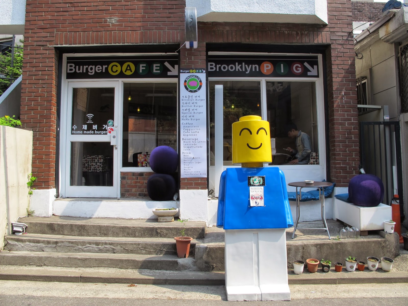 走進橫巷裡,也有很多特色的小店,像這家在外面放了大lego模型的手工漢堡店,lego人微笑著說「歡迎光臨」!