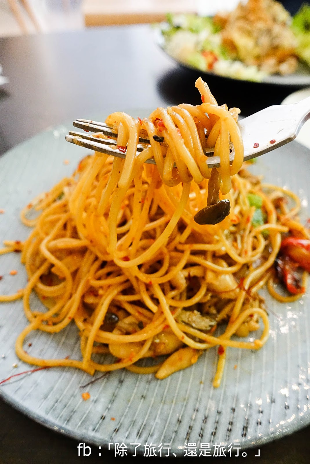 特別為素食者製作的 「乾炒雞肉義大利麵(走雞肉)」,炒得乾身香口且剛剛好的義大利麵帶微辣,因為沒有下雞肉還給我多點菇,非常貼心。