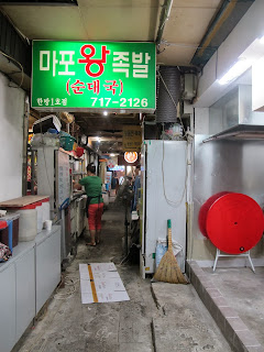 在韓國,我想能夠挑戰烤肉地位,成為韓國人最愛的佐酒美食,應該非豬腳莫屬了。 跟烤肉不一樣,吃豬腳佐的酒是馬加烈米酒(막걸리)。女孩子最愛馬加烈酒+甜梳打水(사이다),兩者合在一起就變成(막싸),和燒酒 + 甜梳打水(소주+ 사이다)變成(소싸)道理一樣。 不過個人偏好燒酒+甜梳打,所以這次來到孔德豬腳一條街,還是點了自己喜歡的。 來這家店,是因為韓國朋友跟這裡的老闆很熟,為著那個「情」,即使其他店家的味道一樣,他們還是常常來這家,和老闆娘閒話家常。